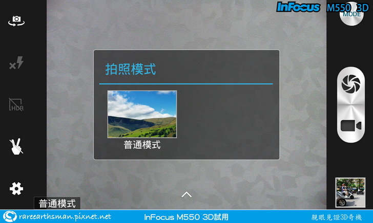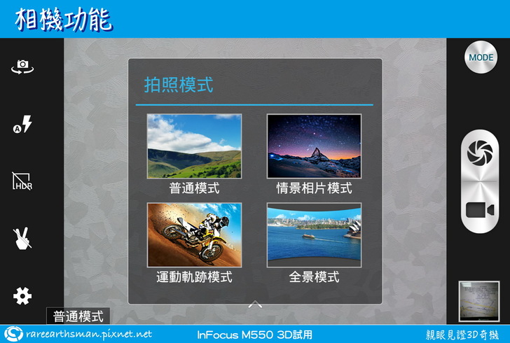 ▲M550 3D的相機功能,螢幕左側欄位是鏡頭選擇/閃光燈/HDR/自動拍照/設定,螢幕右上方是相機模式按鍵,左側中央是快門鍵右下角是照片預覽,主鏡頭有4種拍照模式,分別是普通/情境照片/運動軌跡/全景。