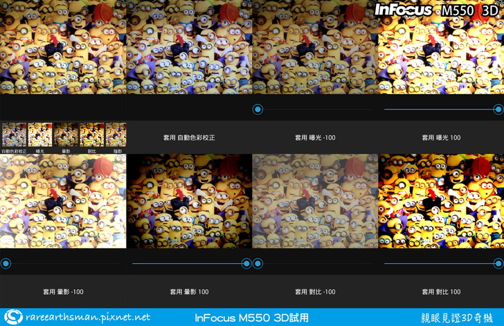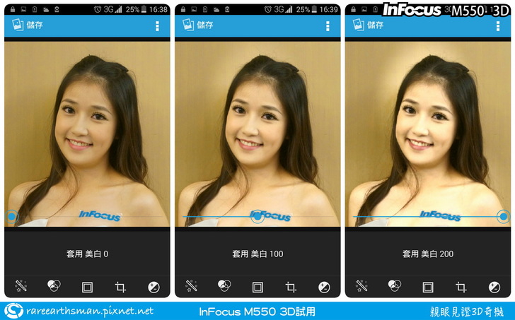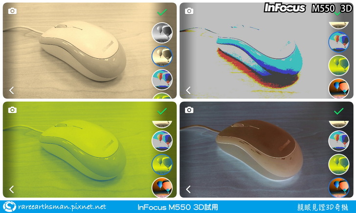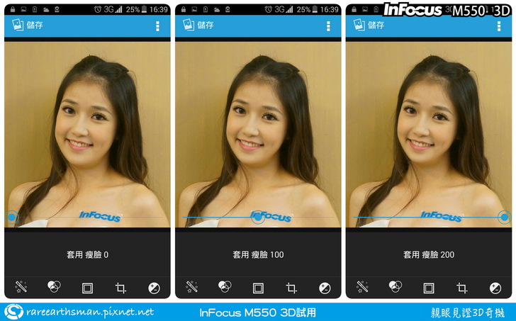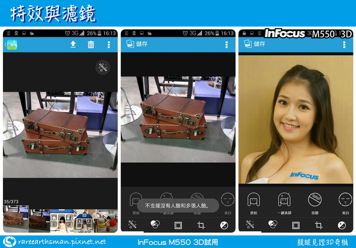 ▲InFocus M550 3D的照片濾淨功能很好用,不單單僅只提供M550相機拍出來的照片才可以使用,只要是在圖片庫裡的照片都可以使用濾鏡,只是有些功能是需要用人臉辨識才能使用的,如果偵測到不是人臉,甚至精準到連公仔的臉都能判定不是人臉,螢幕上會顯示"不支援沒有人臉和多張人臉",反過來如果使用的是人臉,就不會出現這個警示;在圖片庫中每張圖片的右上角都會出現魔術棒的圖案,它就是特效與濾鏡的功能鍵,主要分為上排人臉的特效與下排濾鏡的部分這兩大功能。因為需要用到人臉,所以只能拿出之前去M810體驗會時所拍的SG照片來充當特效的model了。