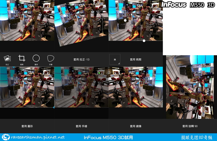 ▲裁切功能,有拉正/裁剪/圓形/手繪/旋轉/鏡像等6種裁切功能,裡面除了手繪功能我試不出來要怎麼裁切,東點西點螢幕都沒有反應,最多只會出現一顆綠點,之後就沒有再多的顯示了,所以這個功能不曉得如何使用外,其實功能看字面就很容易判斷,使用上也很簡單。