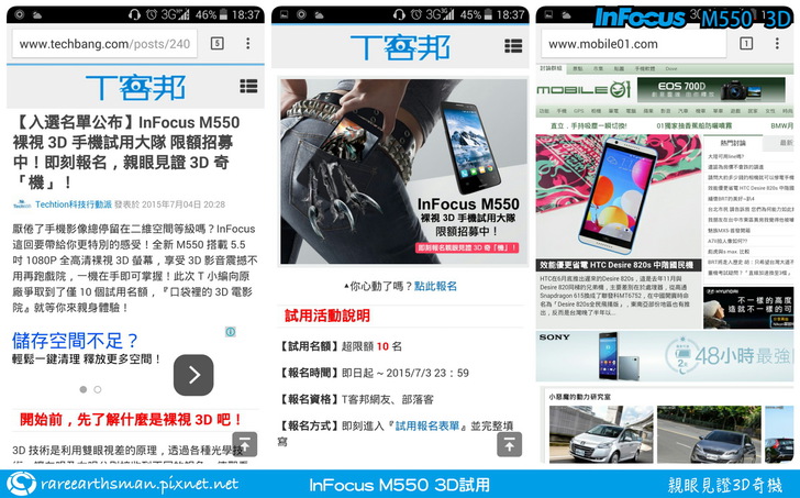 ▲網頁瀏覽器的顯示,InFocus M550 3D沒有自己的瀏覽器,預設是使用Android的Chrome瀏覽器,這是T客邦及mobile01的網頁顯示。