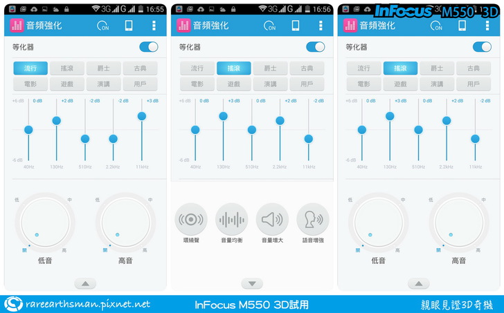 ▲InFocus M550 3D預裝有音頻強化APP,可以選擇套用各項風格音樂的模式,當然也可以手動調整各項控制,包括環繞聲/音量均衡/音量增大/語音強化等各項功能。