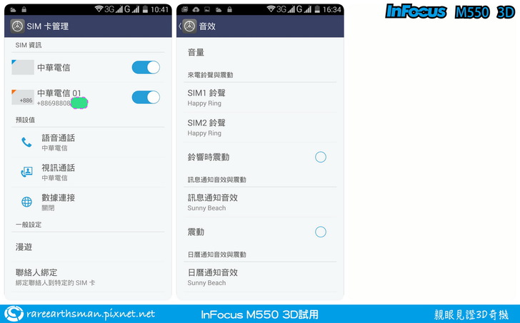 ▲設定/無線與網路/SIM卡管理,InFocus M550 3D支援雙卡雙待,所以在SIM卡管理這項設定會顯示兩張卡的資訊,對於語音/視訊/數據都可以管控,來電鈴聲也可以設定不一樣。