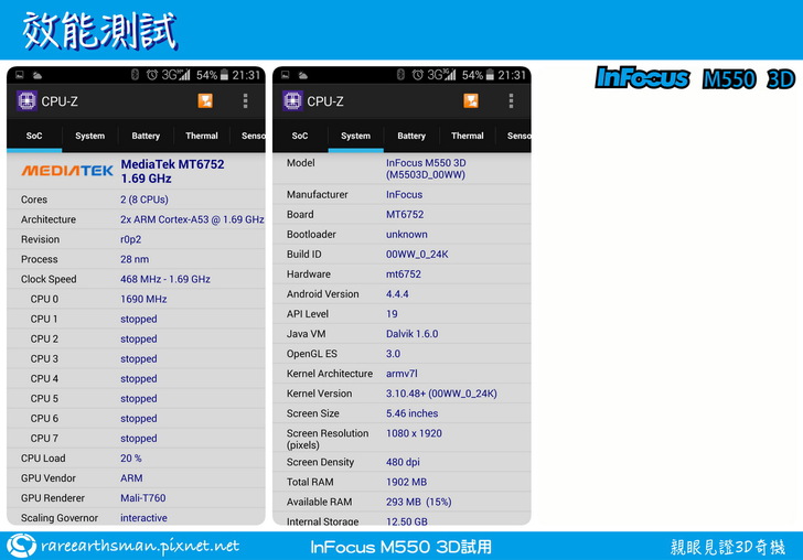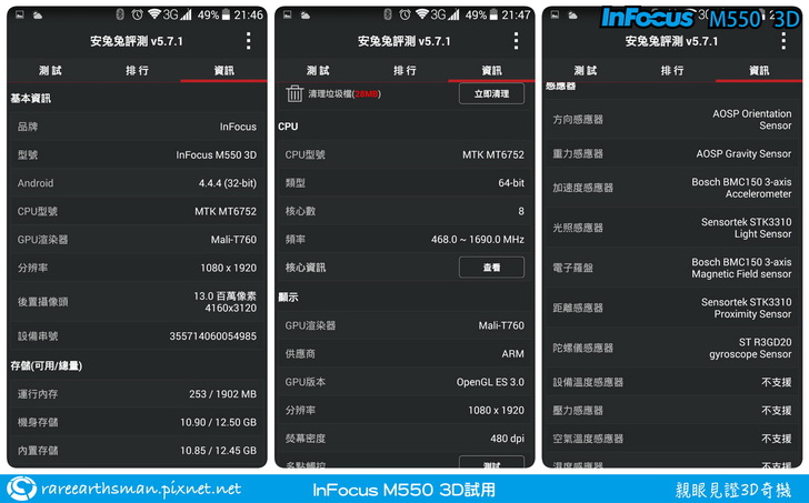 ▲在安兔兔評測的資訊數據,可以看到M550 3D的相關硬體規格,特別在感應器部分有配置了方向/重力/加速度/光照/電子羅盤/距離感應器。