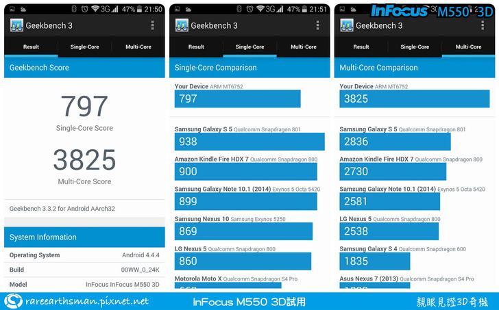 ▲在Geekbench3的跑分結果,單核的分數是797分,並沒有特別出眾,但是在雙核的分數上有3825分,算是表現滿突出的表現。