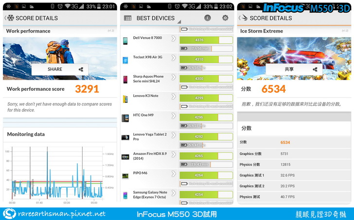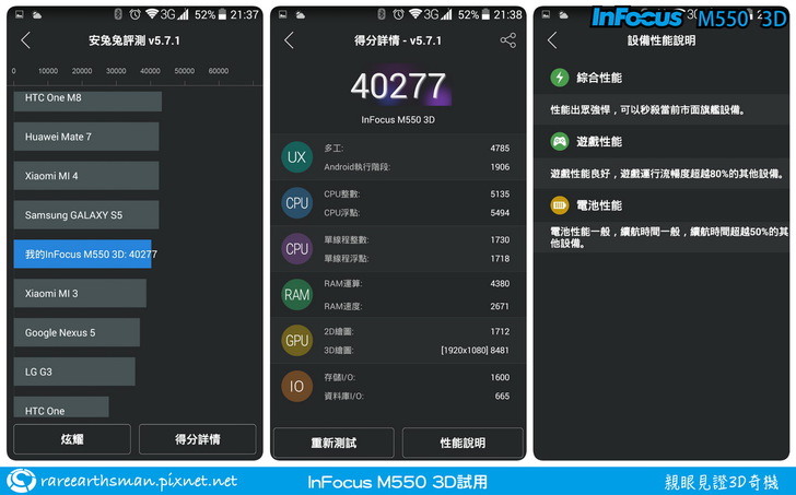 ▲在安兔兔評測的V5.7.1版裡,InFocus M550 3D手機拿到40277分,左側螢幕截圖顯示M550 3D跟相近成績的手機排名,右側性能說明在綜合性能方面算是功能很好,但是電池的成績就一般。