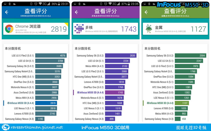 ▲在Vellamo的測試中,M550 3D的預設瀏覽器Chrome分數是2819分,多核的分數是1743分,金屬的得分是1127分。