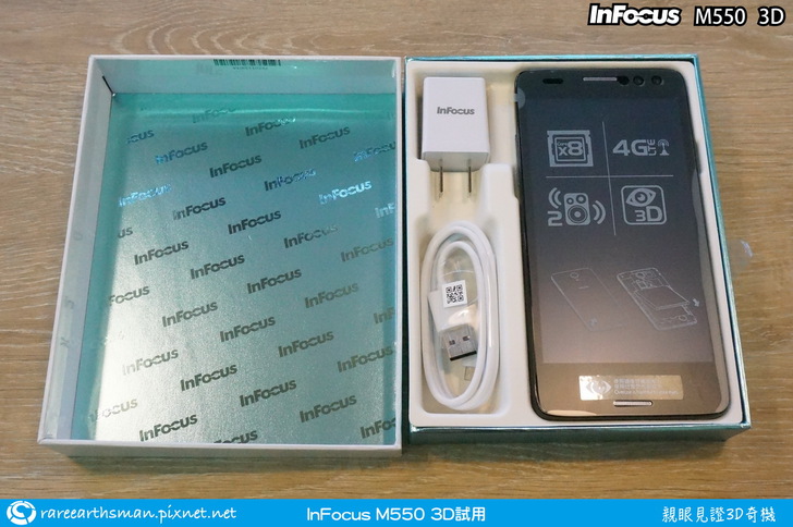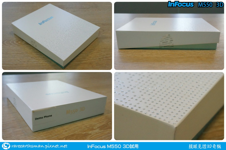 ▲M550 3D的彩盒包裝,其實一般手機的包裝通常長度是差不多的,但是寬度大都是手機寬度再加一點,然後厚度比較高,但是M550 3D彩盒走的方式是寬度變寬,高度變低,左下角在彩盒上蓋有一個造型斜角,正面簡單的一個Infocus燙金Logo,配上用小水晶裝飾出來的陣列圖案,另一邊,彩盒頂端有M550 3D的燙金Logo,方便型號的辨識,其實彩盒外觀設計的還滿不錯的,簡單大方,容易識別也有巧思的融入。