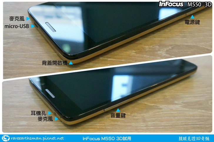 ▲M550 3D四周的功能鍵並不多,手機的上方有耳機孔與麥克風,右側只有電源鍵,左側只有音量鍵,下方有micro-USB連接器、麥克風與背蓋開啟槽。