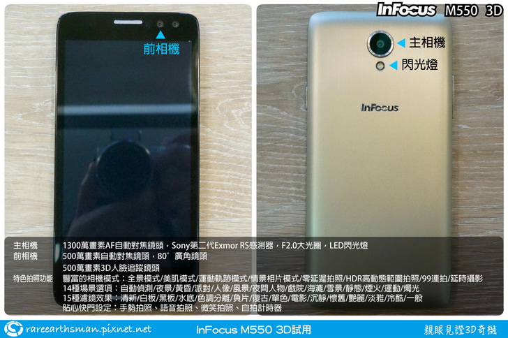 ▲M550 3D的正面與背面圖,我有特別指出相機的部分,圖片下方有前後相機的規格與拍照功能。