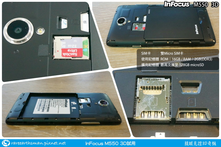 ▲M550 3D配備雙SIM卡與單記憶卡,SIM卡都支援4G,使用的是micro SIM卡,SIM卡的組裝與拆下都需要先將電池移除才可以動作;而記憶卡部分支援最高128Gb的microSD卡,設計上有足夠的空間,所以組裝及拆下都不必拆電池,也就是不必關機啦。