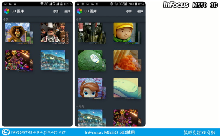 ▲3D圖庫裡面如圖左側,在M550裡面預設了4張3D圖片,如果使用者有拍攝其他3D照片的話,其實照片並不會直接顯示在3D圖庫裡,要按一下螢幕上方的"添加"後,進入裡面選擇要將哪一些拍的照片輸入到3D圖庫中,才會像圖片中央一樣會有其他自己拍照出的3D照片預覽顯示。