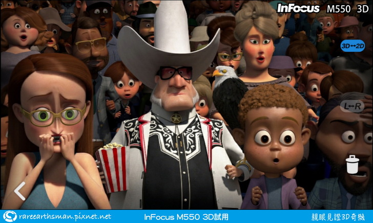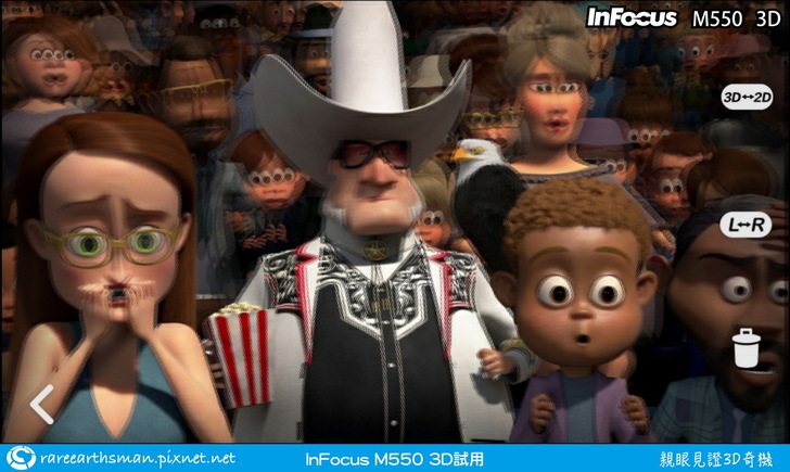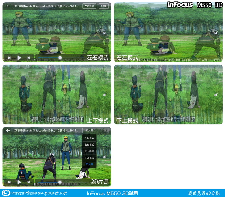 ▲3D播放器可以直接播放3D影片也可以播放2D的影片,我以一般的卡通影片來做簡單的說明,開啟3D效果後殘影就會發生,但是這個殘影的效果就離得太遠了,說真的是沒有3D的效果啦;螢幕右上方有3D效果開關鍵與不同模式選擇,包括左右/右左/上下/下上/2D片源這5種模式。