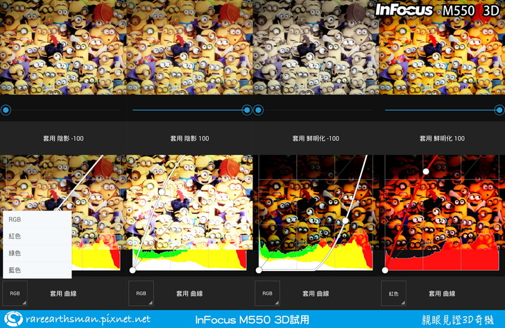 ▼色階調整功能,有自動色彩校正/曝光/暈影/對比/陰影/鮮明化/曲線/色調/飽和度/黑白濾鏡等11種功能,大部分都可以調整藍色圓點位置或者是用曲線方式來控制曲線的變形來即時觀看調整後的效果。
