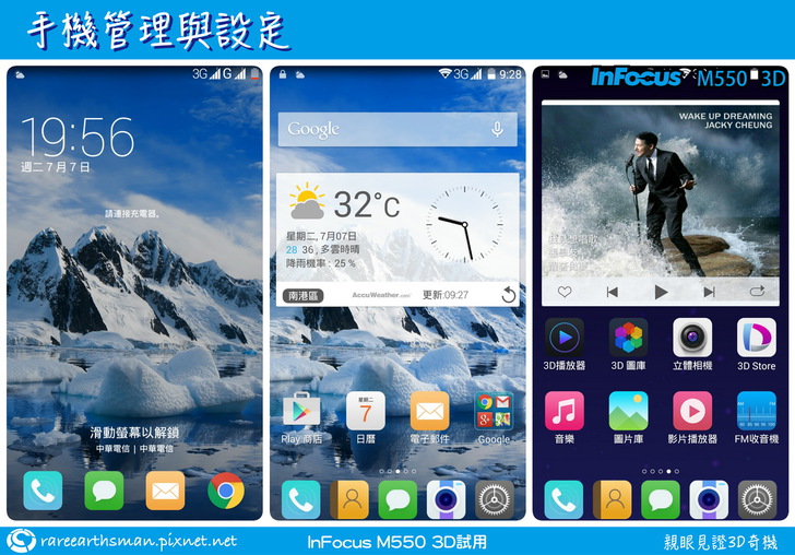 ▲左側是InFocus M550 3D手機的待機預設畫面,中央是預設的首頁,右側是其他頁面。