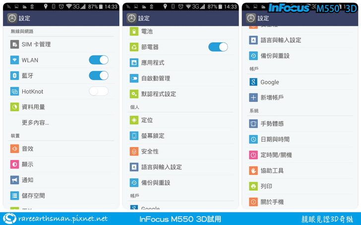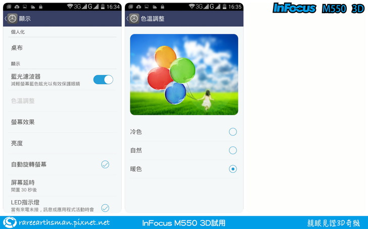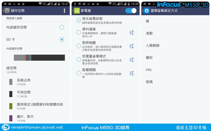 ▲設定/裝置/儲存空間,InFocus M550 3D內建記憶體是16Gb,預設系統使用了3.55Gb,還有約12Gb空間可以使用,當然可以使用記憶卡,最高支援128Gb microSD。在設定/裝置/節電器中可以任意調整那些功能的開關與使用何種模式。螢幕鎖定方式。