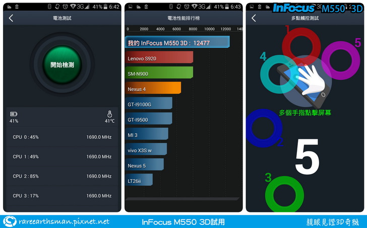 ▲在安兔兔評測的硬體檢測APP裏可以做螢幕檢測/多點觸摸/灰階試/彩條測試/電池測試/手機真假,每項測試都做了,其中電池測試我是充飽100%的狀況去以最高階80%去做測試的,成績是12477分,這分數怎麼好到有點誇張,但是這次測試跑了好幾個小時,說真的也沒時間重做了,圖面中有顯示相關機型的排名;另外多點觸摸方面可以做多點觸控的測試,實際測試M550 3D可以同時做5點的觸控。