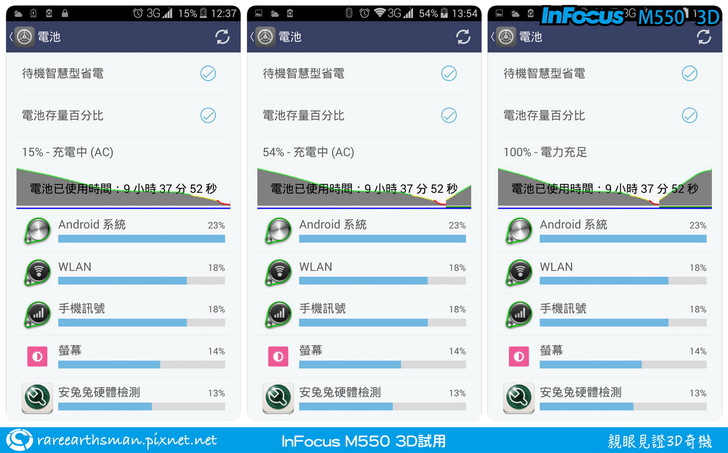 ▲在電池的測試部分,首先將電池裡的電力全部放光讓手機沒電到自動關機,然後開始使用InFocus原廠提供電充電配件充電,37分鐘後顯示電力15%,1小時25分電力39%,1小時54分電力54%,2小時46分電力81%,4小時手機顯示電力100%,沒有快充的功能,要完全充到滿要4小時,時間是滿久的,使用上有可能會不方便。