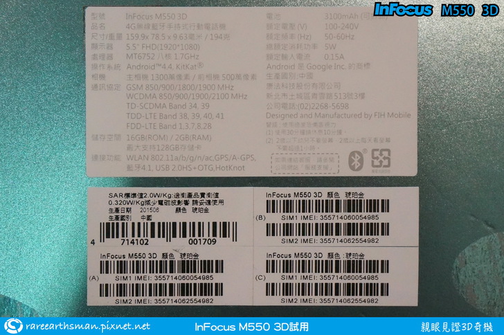 ▲M550 3D彩盒底部的規格貼紙與手機序號資訊。