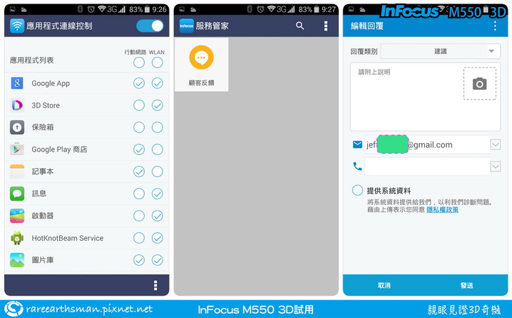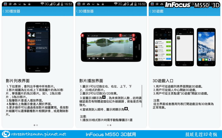 中低價手機在這兩年來算是手機市場的新寵,以往高價高階的手機有的功能,平價手機也越來越接近了,規格也相近,在性價比的比較之下,平價機當然會比較吃香,所以也擠壓了高價品牌的手機市場,投入平價手機市場的品牌也就越來越多;InFocus這個平價手機新品牌夾帶著鴻海製造,在中低價手機市場闖出了一片天,每年都有好幾隻新手機的產量出來,在這個等級的手機市場來說已經算是產出數量多的,每隻也都有各自的特色。但是現在手機市場群雄並起,諸侯與地豪已經開始大亂鬥的戰場上,InFocus新推出的M550手機強打的是3D裸視功能,手機螢幕不就是平面的嗎?要如何表現出3D效果呢?就容我將這一周實際體驗這支手機的感覺分享吧。