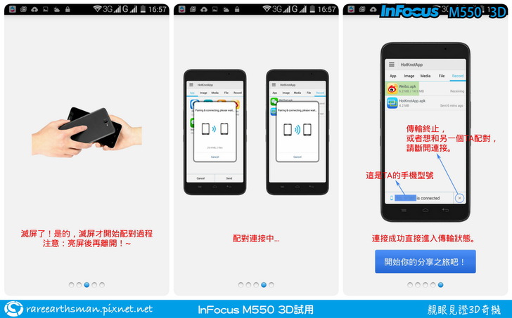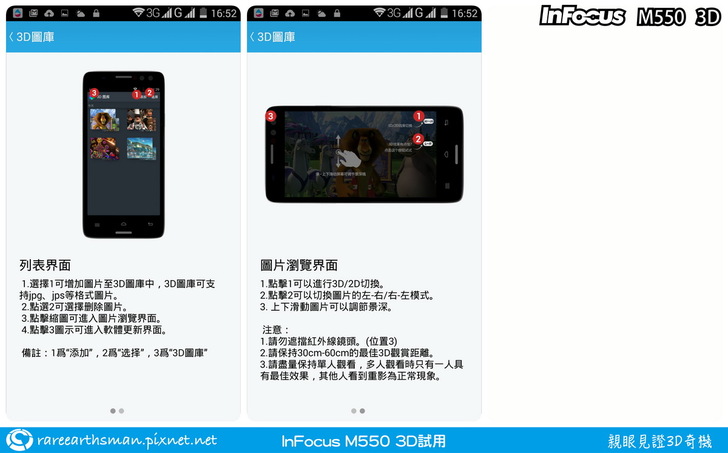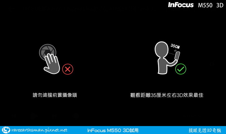 ▲在首次觀看3D圖片之前,手機會教導使用者如何操作,當然不能遮住鏡頭,建議距離是35公分左右是原廠建議的最佳觀看尺寸。