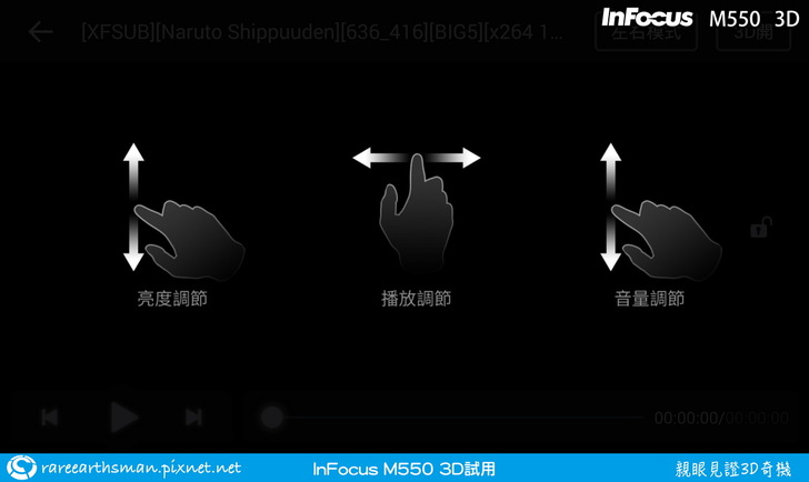 ▲使用3D播放器觀看3D影片時,螢幕左側上下滑動可以調整亮度,左右滑動是播放調節,螢幕右側上下滑動是控制音量。