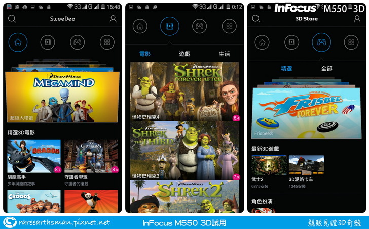 ▲SweeDee是一個3D相關影片與遊戲的平台APP,有一些3D電影可以觀看,3D電影部分觀看是需要點數的,3D遊戲可以先下載一些Free的來試玩,影片部分可以連接到Youtube看一些3D立體的影片。