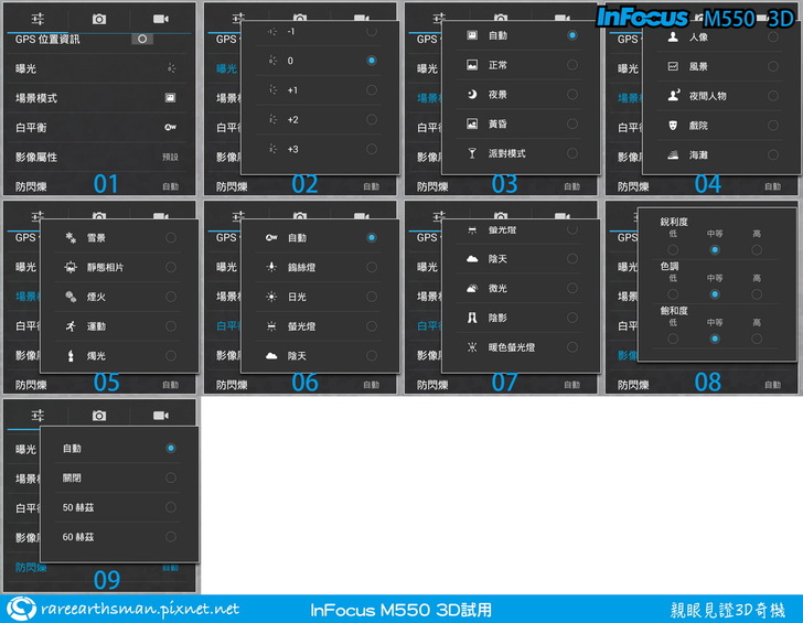 03-05:場景模式有15種可以選擇,包括自動/正常/夜景/黃昏/派對模式/人像/風景/夜間人物/戲院/海灘/雪景/靜態照片/煙火/運動/燭光。