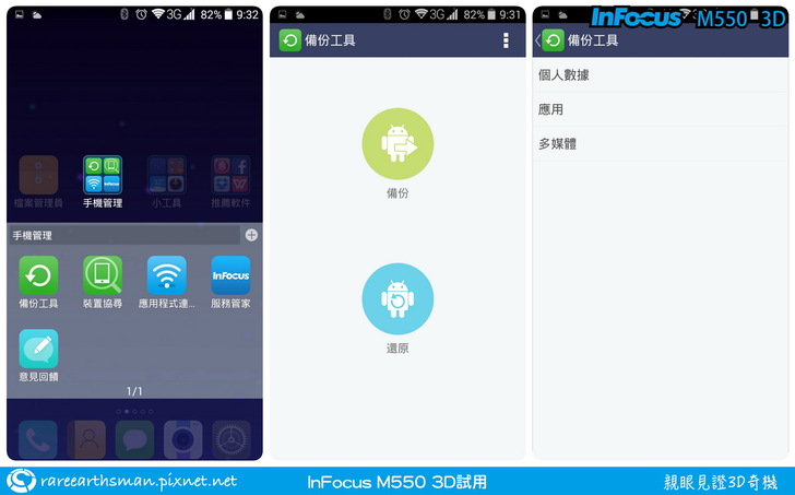 ▲InFocus M550 3D預設了一個手機管理的群組,在備份功能方面可以選擇備份或還原,備份工具可以選擇個人數據/應用/多媒體。