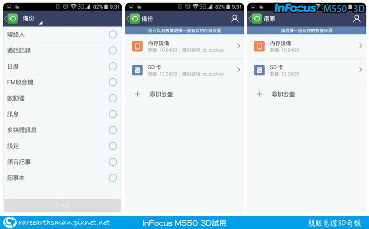 ▲可以將個別資料選擇備份到內存設備/記憶卡/雲端中,當然也可以選擇從儲存設備中還原回來。