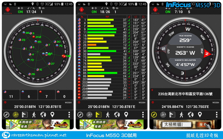 ▲使用AndroiTS GPS測試這款APP,在大樓頂樓可以收到美國的11顆衛星,俄羅斯6顆衛星與中國的7顆衛星,如果是在戶外屋簷下,APP找到的衛星數就少很多了。另外也稍微測試的一下電子羅盤的功能。