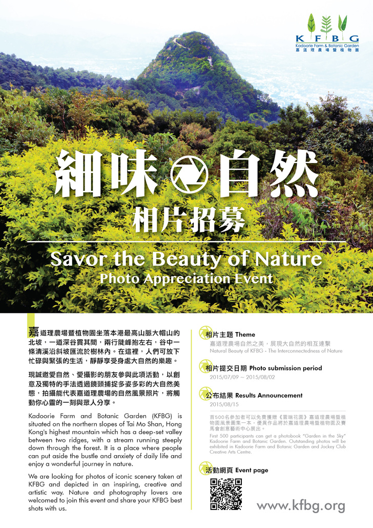 嘉道理農場暨植物園「細味。自然」相片招募 現誠邀愛自然、愛攝影的朋友參與此項活動,以創意及獨特的手法透過鏡頭捕捉多姿多彩的大自然美態,拍攝能代表嘉道理農場的自然風景照片,將觸動你心靈的一刻與眾人分享。 相片主題:嘉道理農場自然之美,展現大自然的相互連繫 首500名參加者可以免費獲贈《雲端花園》嘉道理農場暨植物園風景圖集一本,優異作品將於嘉道理農場暨植物園及賽馬會創意藝術中心展出。2015年8月2日截止。 活動詳情及遞交相片: http://www.kfbg.org/chi/photo-appreciation.aspx 讚 收藏 快速回應 引言回應