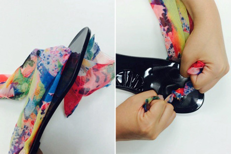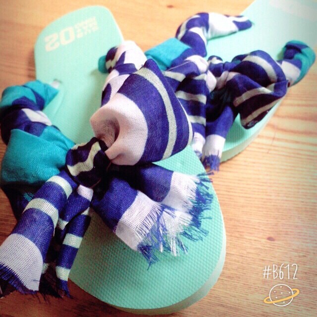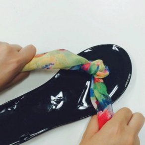 將絲巾裁成適當大小,如圖折半後將折半處穿過夾腳拖中間拉個小洞