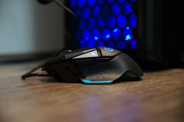 G502 總共有十二顆按鍵,包括基本的左右鍵與中鍵、左右傾滾輪,在自訂鍵部分,大拇指可觸及的範圍有三顆。滾輪後方的滑鼠中央也有一顆,但這顆的位子有點奇葩,要整隻手往後才按的到啊。比較特別的是,不像部分有飛梭滾輪功能的滑鼠,透過下壓滾輪的方式來切換滾輪模式,G502 則是在滾輪後面用一個按鈕獨立出來,因此不會影響中鍵的功能。