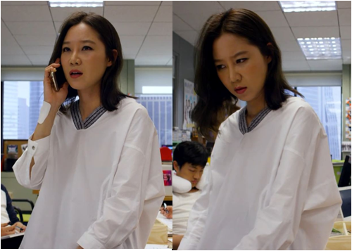 相信大家都知道今年相當流行的一股趨勢就是寬版(OVERSIZE)的衣服,這應該不用小編再提醒大家了吧?老實說合身的風格久了也會膩,再加上現在天氣越來越熱(擦汗),寬版的衣服真的是大家的救星(歡呼!!),孔孝真歐逆當然也不會漏掉這個部分啦,在劇中的這件長版罩衫整體來說相當的寬鬆舒服,雖將身體線條覆蓋住,在袖口的部分卻多了點小巧思,九分寬袖口上點綴的一顆鈕扣,讓整體寬鬆的風格不致過於休閒散漫,而在領口的V領灰黑條紋設計,則是讓整體全白色的長罩衫上帶出了一個重點,不管休閒或是上班時都相當適合的款式喔~