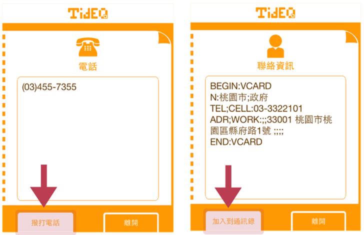 另外,它不只是能連結網址,還有其他特殊的功能,舉例來說,假如掃到的QR Code裡面的資訊是電話或名片格式,那麼就會出現像下圖中的選項,方便你直接撥打電話或是把別人的資訊存到手機裡,相當實用喔!