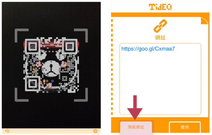 對準畫面中間的框框,手機發出逼一聲後就會跳到右邊的畫面,確認網址後點下”開啟網址”就可以連到你想要去的網站了!