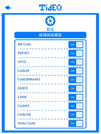 Tide Q Scanner裡總共支援10種條碼類型,像是:QR Code、Aztec Code、UPCE……,可以到控制選單裡自由的選擇關掉或打開。PS.我都不知道原來條碼有這麼多種類型,這樣的話,應該大部分的條碼都掃得到了吧!