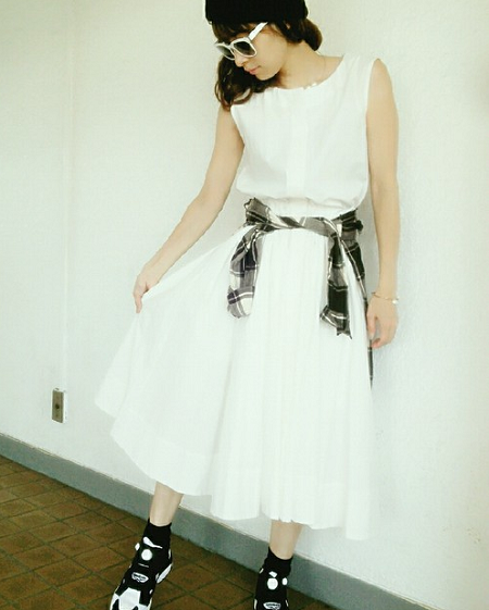 ▼夏天一定要有的純白色洋裝,在腰間繫上格紋襯衫,搭配黑色運動鞋也很好看唷