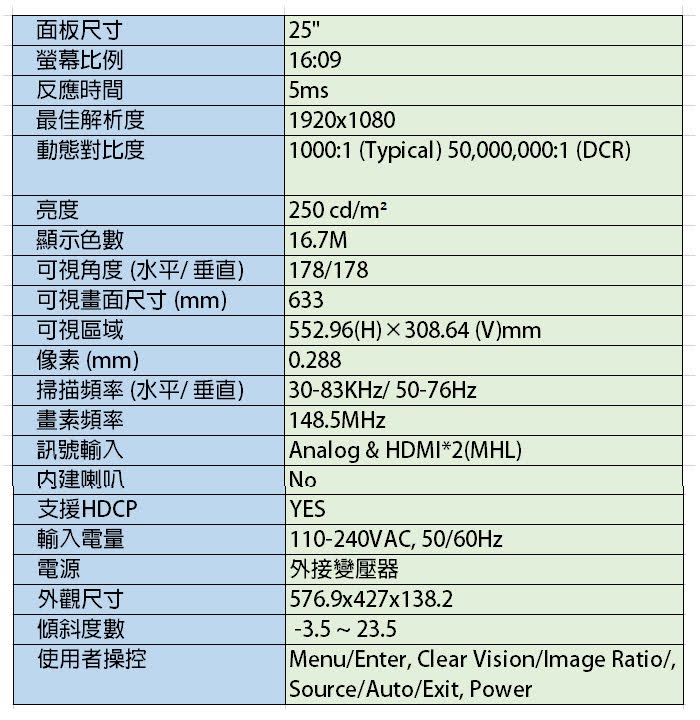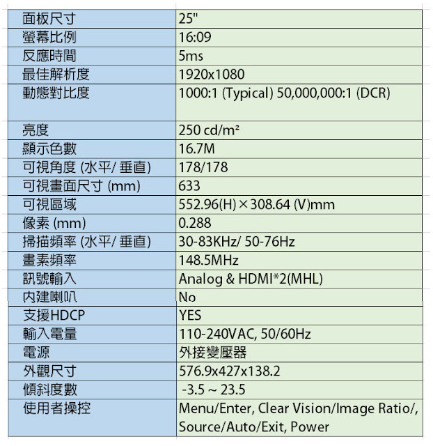 ▼使用前先來看一下 AOC I2579VM AH-IPS 液晶顯示器的簡易規格吧。