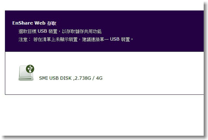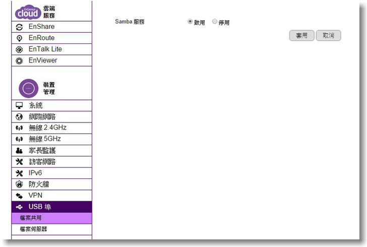 ▲「USB埠」能讓EPG5000上的USB埠加上儲存裝置成為網路硬碟。在『檔案共用』中開啟SAMBA功能,就可透過 Windows 讀取、共用檔案。