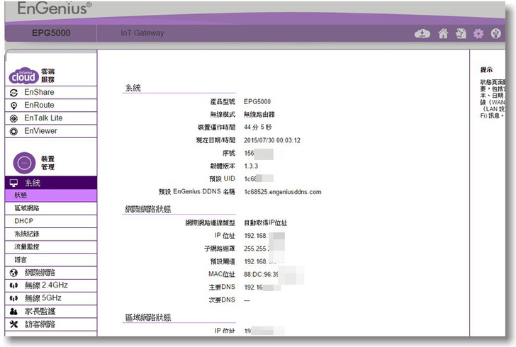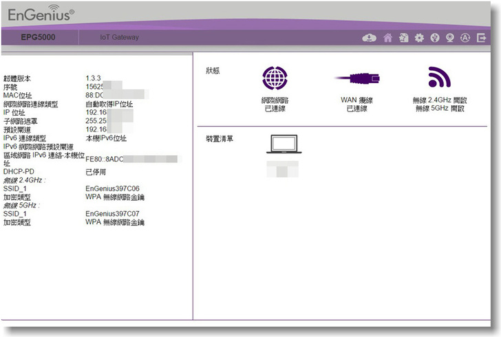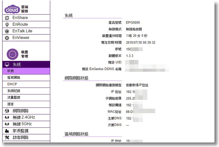 ▲回到《網路設定》來逐一看看細項,一開始出現的『狀態』頁,把EPG5000的各項狀態都列出來。包含目前系統狀態摘要,如系統(硬體 / 軟體版本、日期 / 時間)、網際網路連線(WAN 設定)、區域網路(LAN 設定)和無線網路 (Wi-Fi) 訊息等。