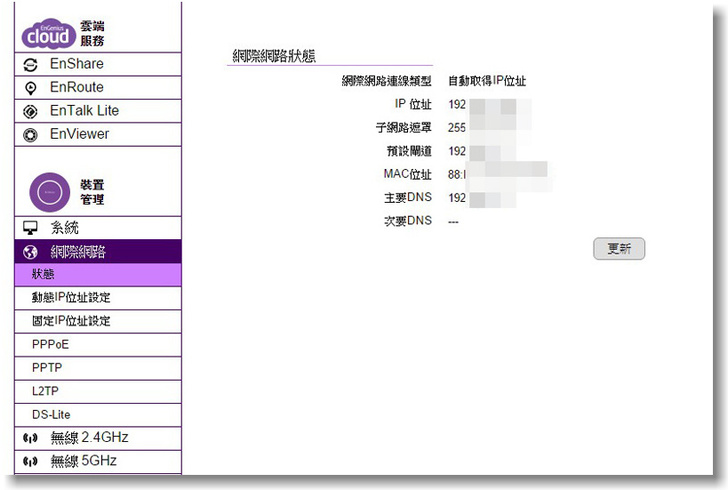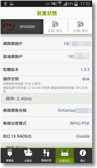 ▲包含《裝備狀態》,可以看到IP、韌體版本、雙頻無線的設定等