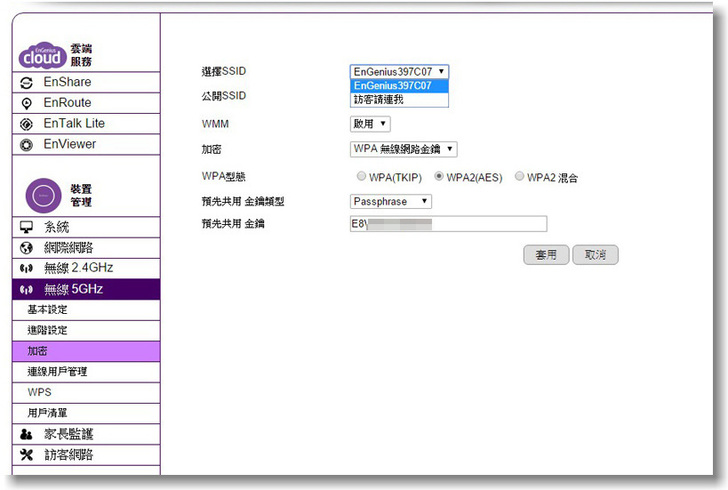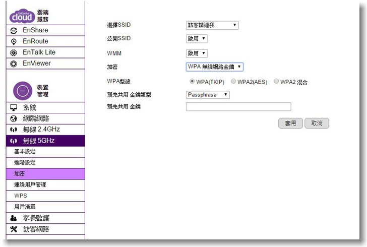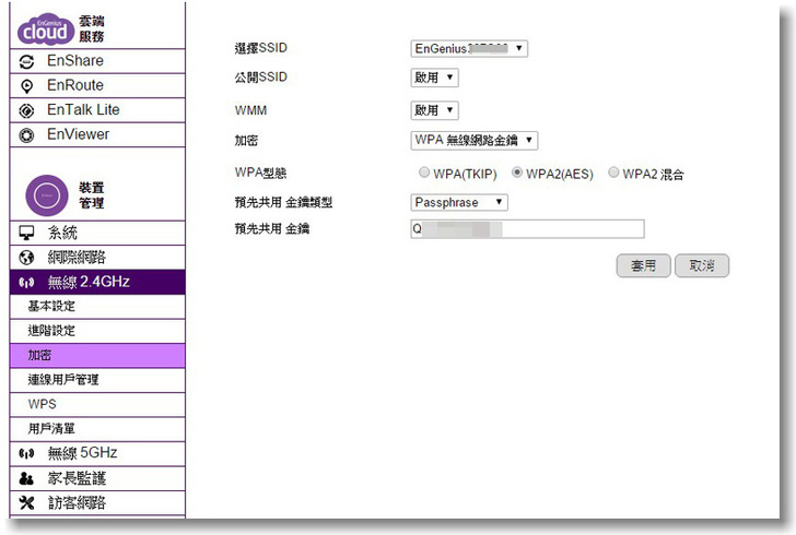 ▲『加密』可以選擇口加密型態與金鑰密碼等,讓無線路由器更安全