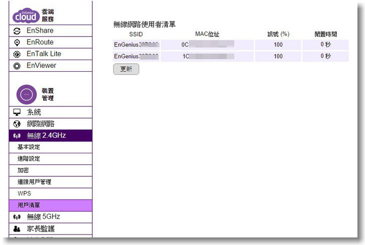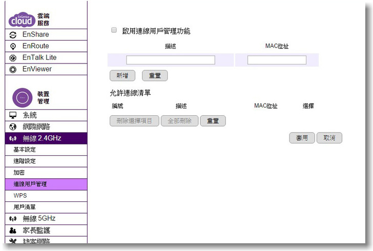 ▲『連線用戶管理』中,選擇啟用連線用戶管理功能後,僅允許使用表格中的 MAC 位址的使用者連線至無線網路,比起一般密碼的安全性更高。