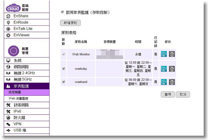 ▲啟用「家長監護」功能可讓家長過濾並控制網際網路存取。可以新增關鍵字來過濾,或將網際網路存取限制在指定時間和日期範圍內。並可以將原則套用至多名使用者。