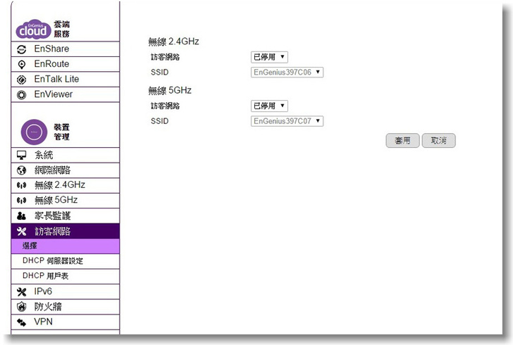 ▲在「訪客網路」中,『選擇』設定可以啟用或停用訪客網路 SSID。 啟用訪客網路與其他無線網路SSID以及LAN 連接埠區隔。確保使用者內網資料安全。而訪客網路SSID僅能連接網際網路,無法連結區域網路。