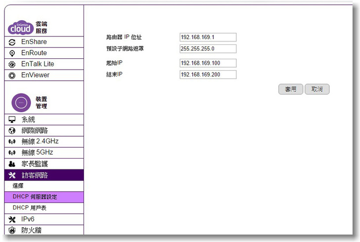 ▲『DHCP伺服器設定』可以設定訪客網路 DHCP 伺服器。 訪客網路 SSID 應與 DHCP 伺服器在不同的子網路 IP 位置。