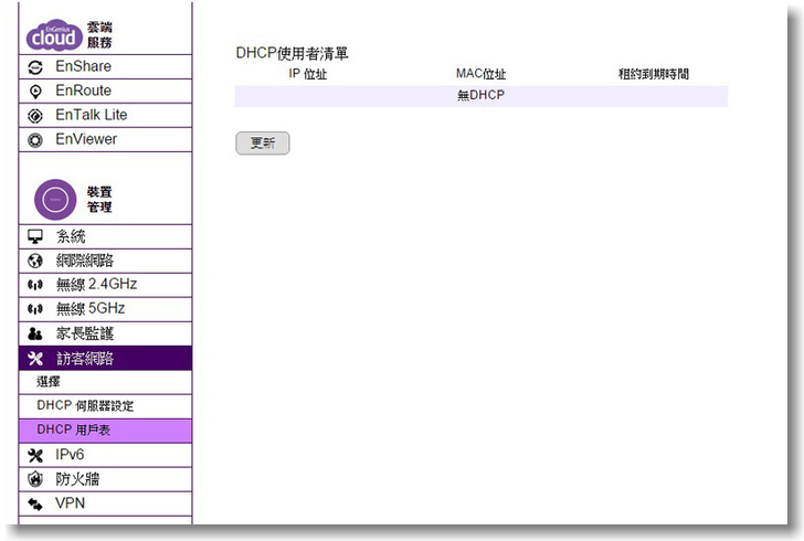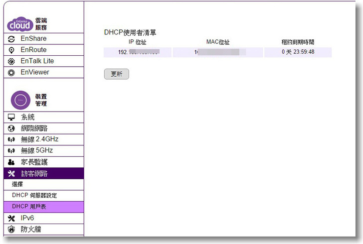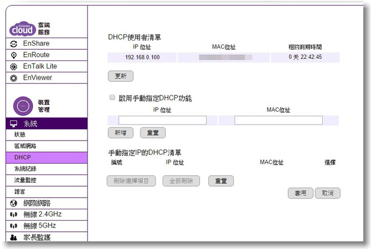 ▲『DHCP』設定,上方的DHCP清單為目前使用中的所有 IP位址。每個 IP位址均指派至特定 MAC 位址的裝置。按一下 [更新],即可取得最新的 IP 位址設定。而啟用手動指定DHCP功能可根據使用者的 MAC 位址取得固定的IP位址。