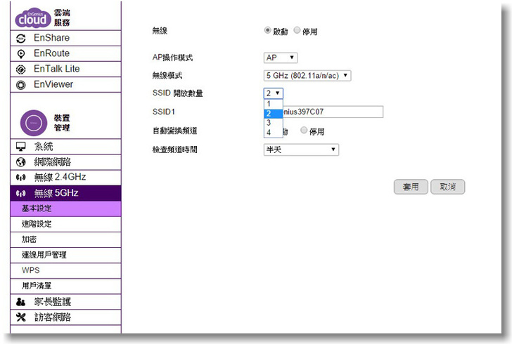 ▲這邊也立即來進行訪客設定,先到前面說明過的「無線2.4GHz」或「無線5GHz」中來進行,我以5GHz作示範,從『基本設定』中選擇開放2組SSID