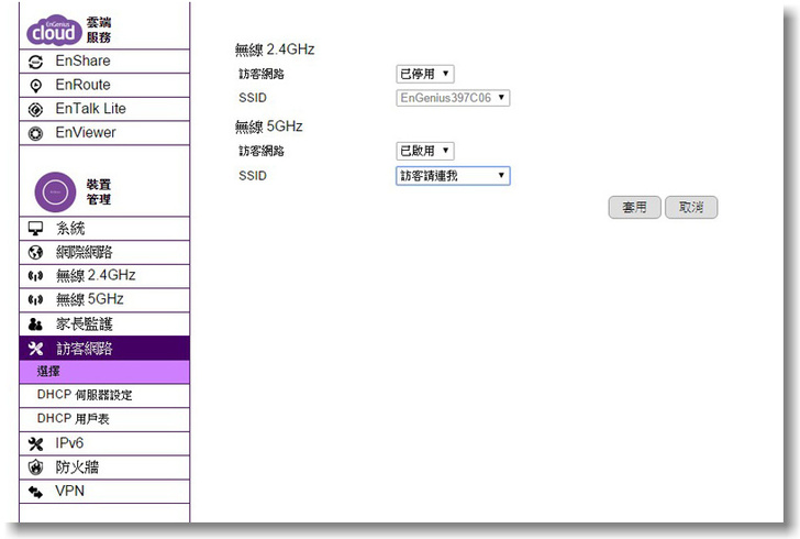 ▲再回到「訪客網路」中選擇啟用,並選擇SSID為剛剛設定的《訪客請連我》